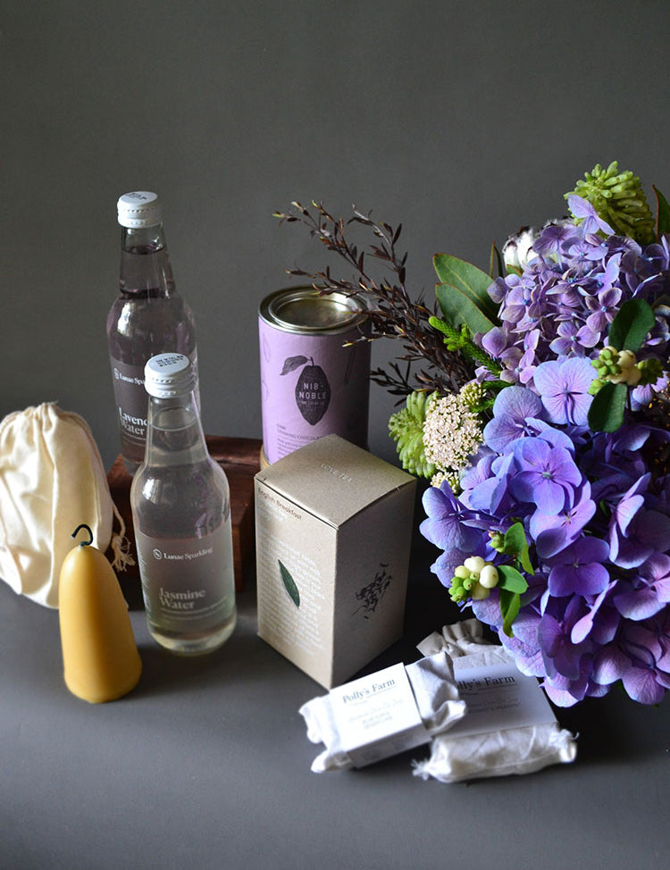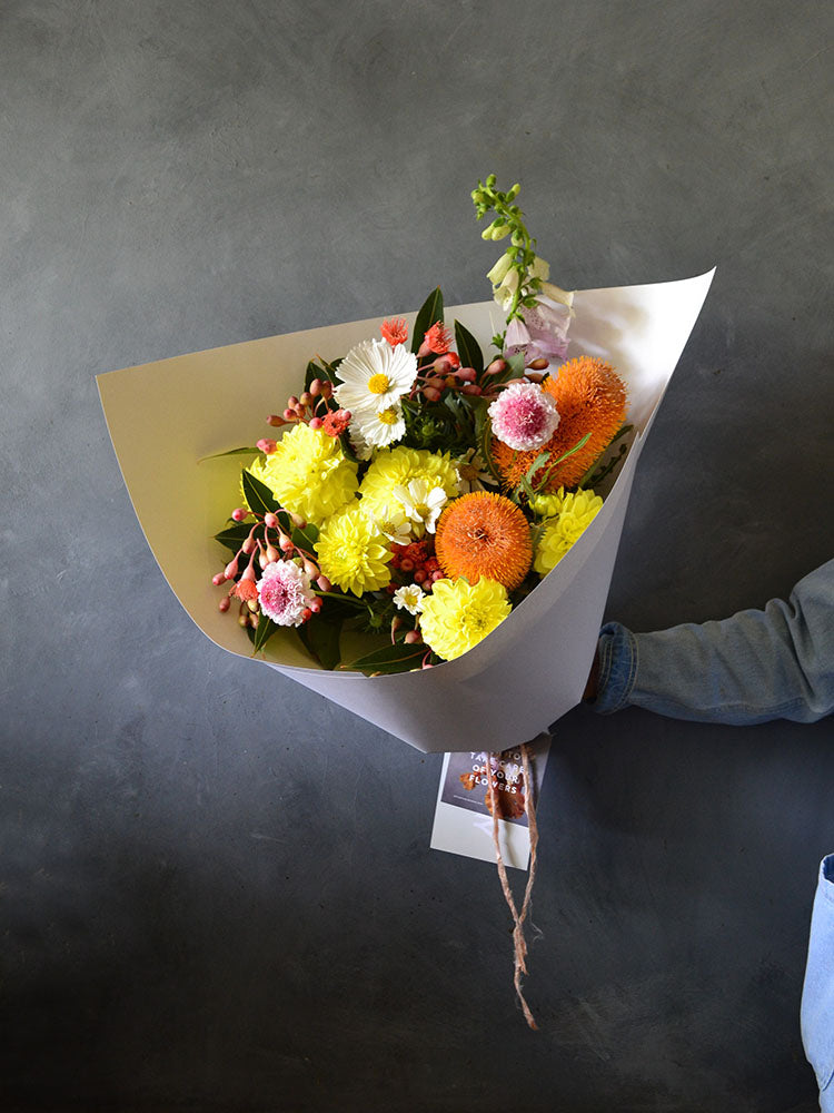 Beautiful, locally grown + seasonal flowers presented in our environmentally responsible gift wrapping.