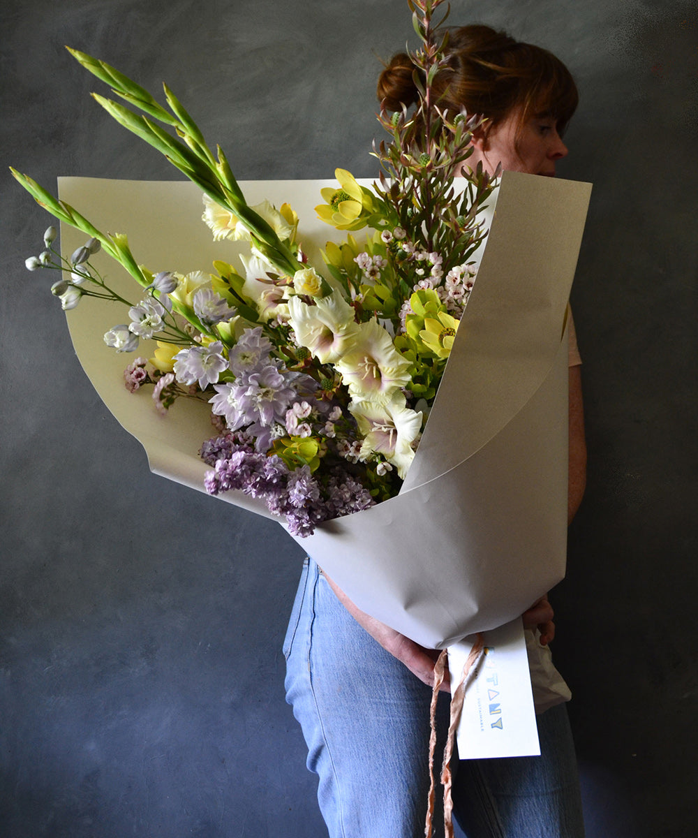 Beautiful, locally grown + seasonal flowers presented in our environmentally responsible gift wrapping.