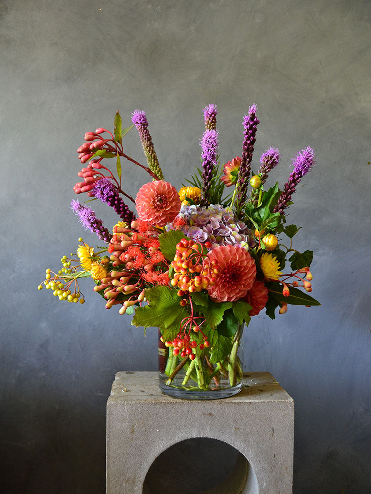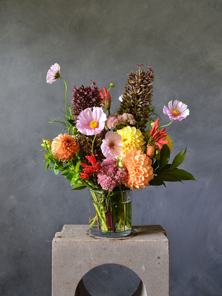 We source all of the flowers for this arrangement from local farms, and use only seasonal varieties. Images should be taken as a colour reference only.