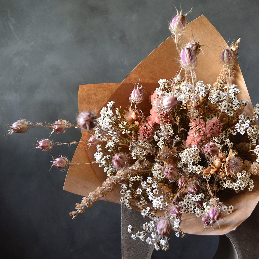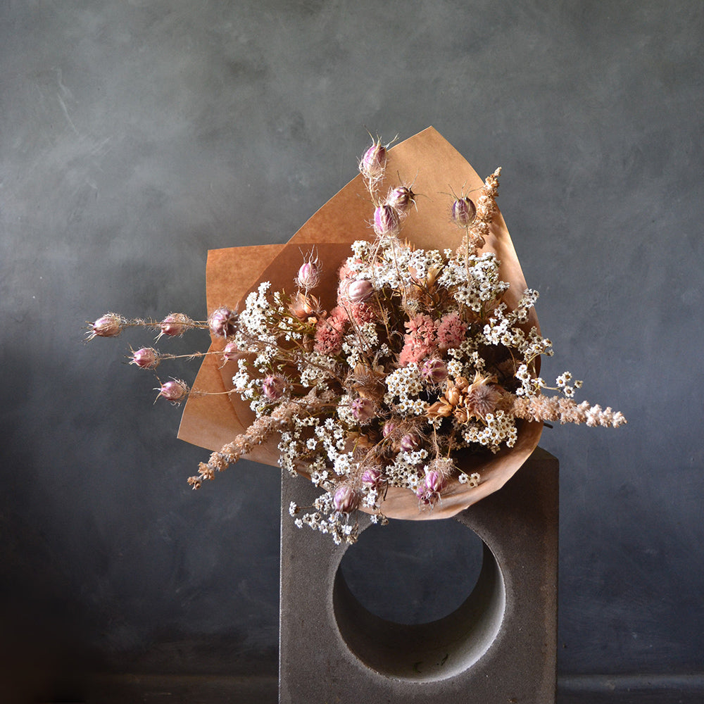 All of our dried bouquets come wrapped in recyclable brown paper and natural twine, with a compostable Botany tag attached.