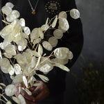 The discs must be prepared by hand-peeling the outer layer off each side of the disc individually – a delicate and time-consuming process that reveals the pearly inner layer that lunaria is so well-known for. This process showcases the see-through silicles (similar to seed pods) and gives lunaria the “moon-like” appearance that it is named for.