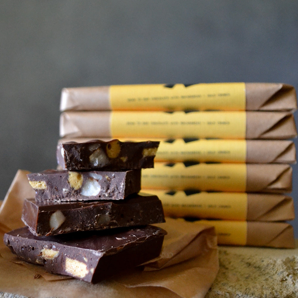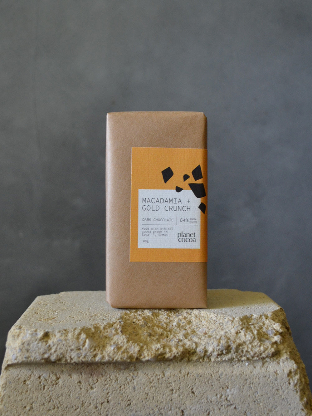 INGREDIENTS: 64% dark chocolate (Samoan cacao beans, Peruvian cocoa butter, Australian raw sugar), roasted macadamias, salt, gold crunch (organic rice malt syrup, sugar, bicard soda). Each block is 65gms.