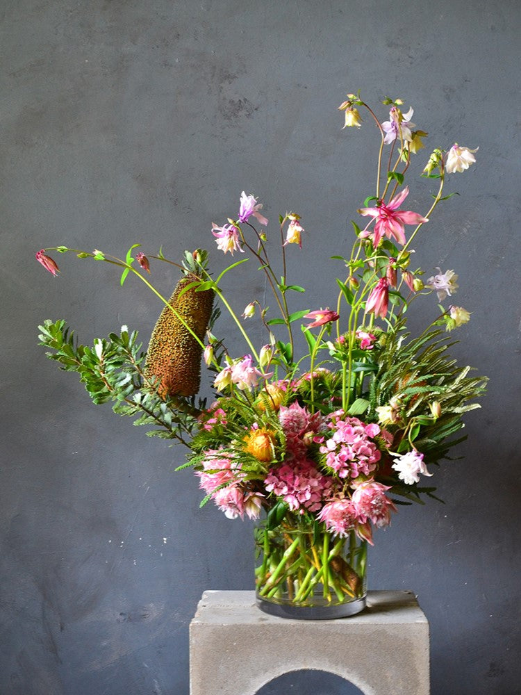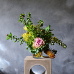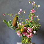 Please note that the flowers pictured are for colour reference only. Actual arrangement will be made bespoke with a similar seasonal mix of pink and yellow flowers in our beautiful Botany style.
