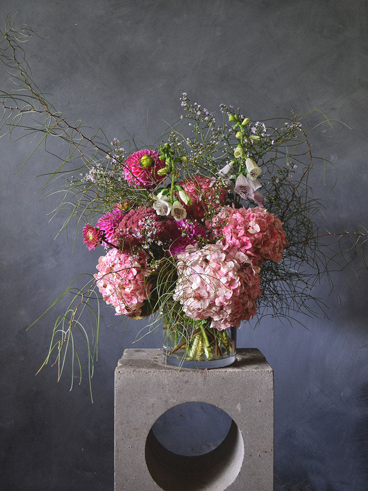 We select the blooms for this arrangement from our local flower farms and use only flowers that are in season to ensure the best quality. Each arrangement is unique and created with skill by our trained florists so no two vases are alike, therefore the images should be taken as a guide only.