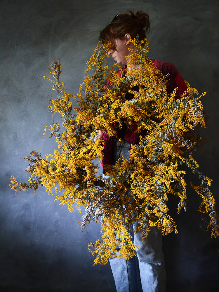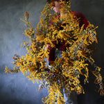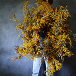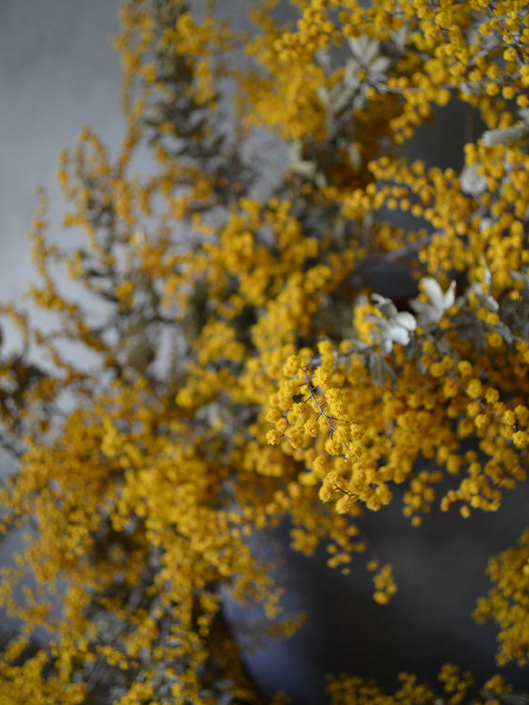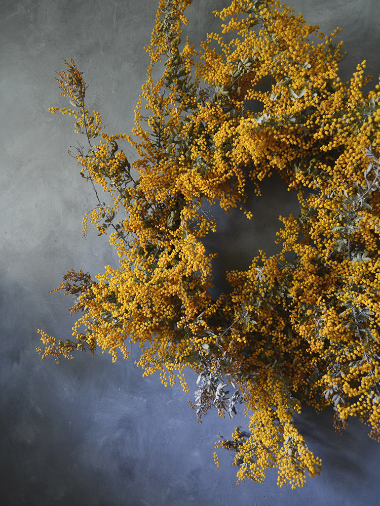 Mimosa is more commonly known as wattle, and is a much loved Australian flower. When naturally dried it holds its colour so well, creating the beautiful, warm yellows for this wreath.