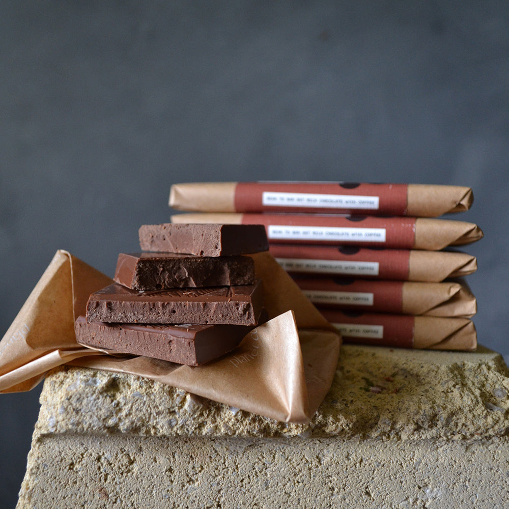 Whole coffee beans from Core Roasters in Brunswick are blended with ethically sourced cocoa beans to create a smooth, vegan milk chocolate.