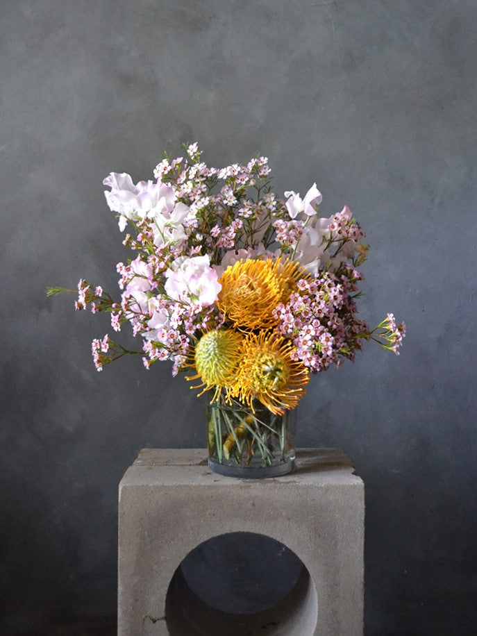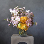 Please note that the flowers pictured are for colour reference only. Actual arrangement will be made bespoke with a similar seasonal mix of pink and yellow flowers in our beautiful Botany style.