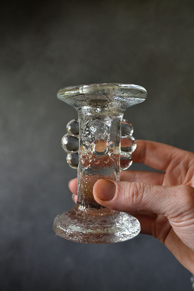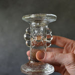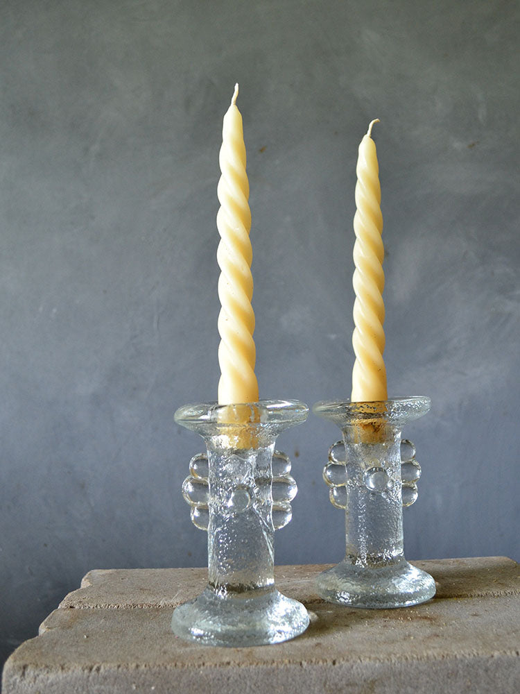 Incredible mid-century glass candle holders by Pukeberg Sweden. These candle holders will fit our spiral candles comfortably, or our taper candles with a small amount of wax shaved off the bottom.