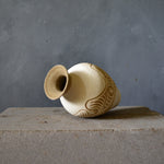 A gorgeous, natural ceramic vase that shows off the beautiful fine texture and colour of the clay. The pattern engraved around the edge is a lovely taupe which contrasts nicely against the bone colour of the vase.