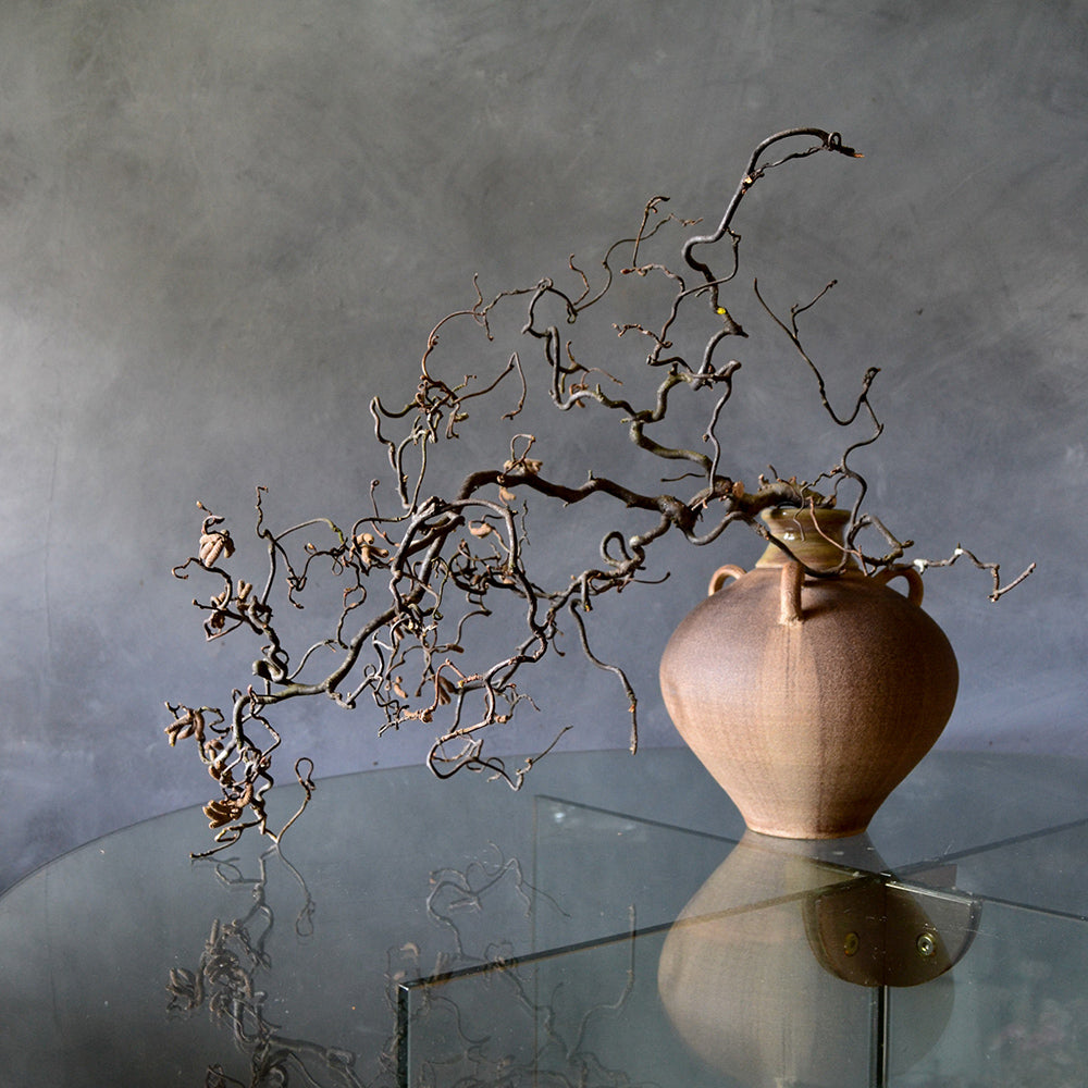 This urn has a good weight and could hold larger branches like twisted willow or corked elm. The smaller neck makes arranging a few stems much easier, and it features three decorative handles.