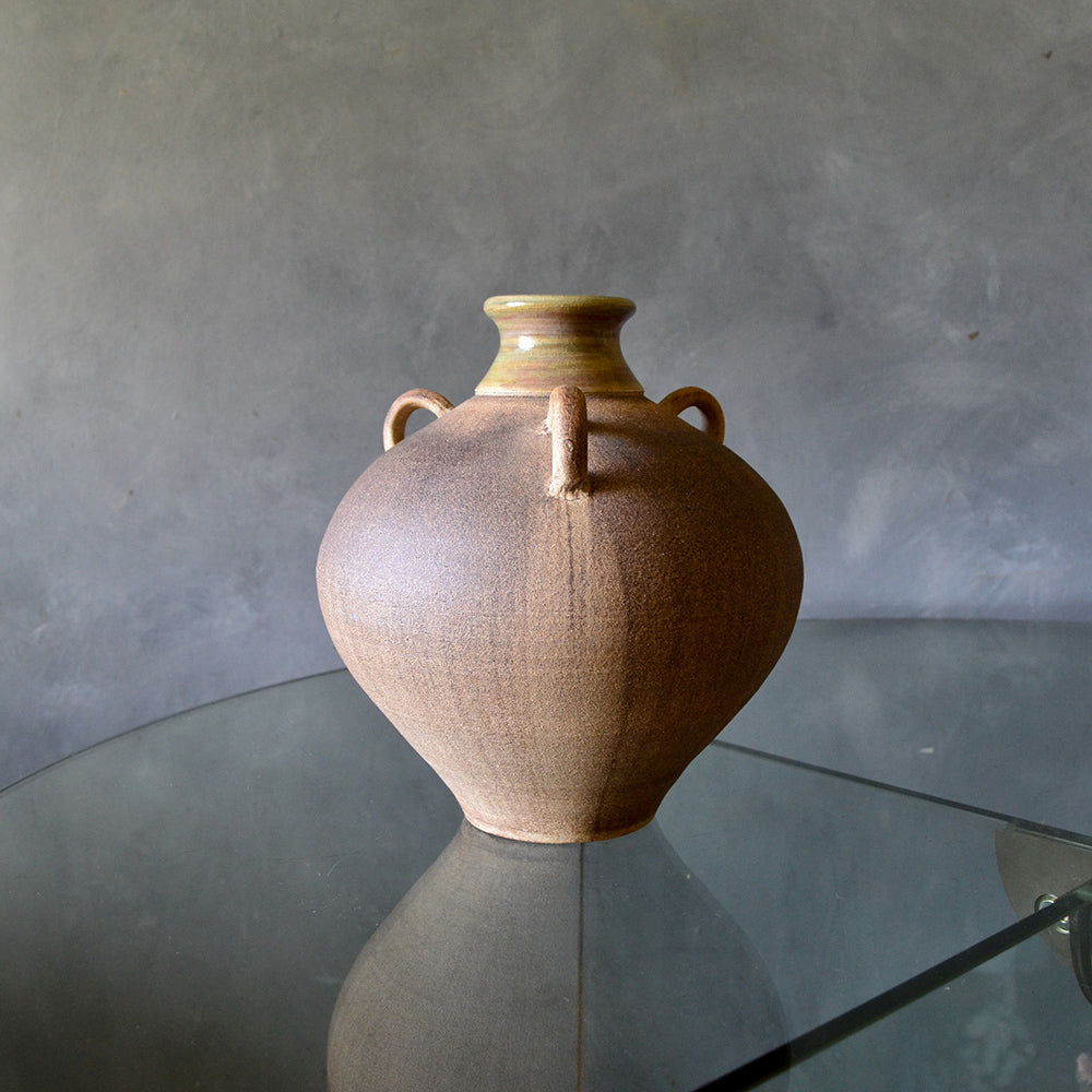 Textured, raw clay features heavily in this beautiful vintage urn. The soft copper tones work wonderfully with the hint of green around the neck, which looks just like aged copper. A stunning piece that will never go out of style!