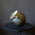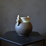 This vintage vase features a unique handle design with a light blue-green glaze. The rest of the vase is a lovely dark matte grey, and the inside is fully glazed. Although designed as a vase, it would also look great with a small pot plant sitting inside.