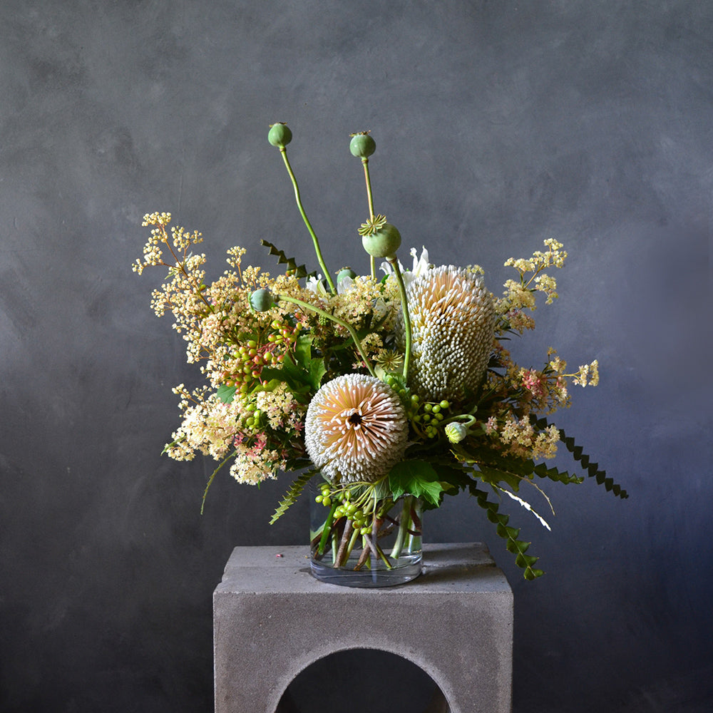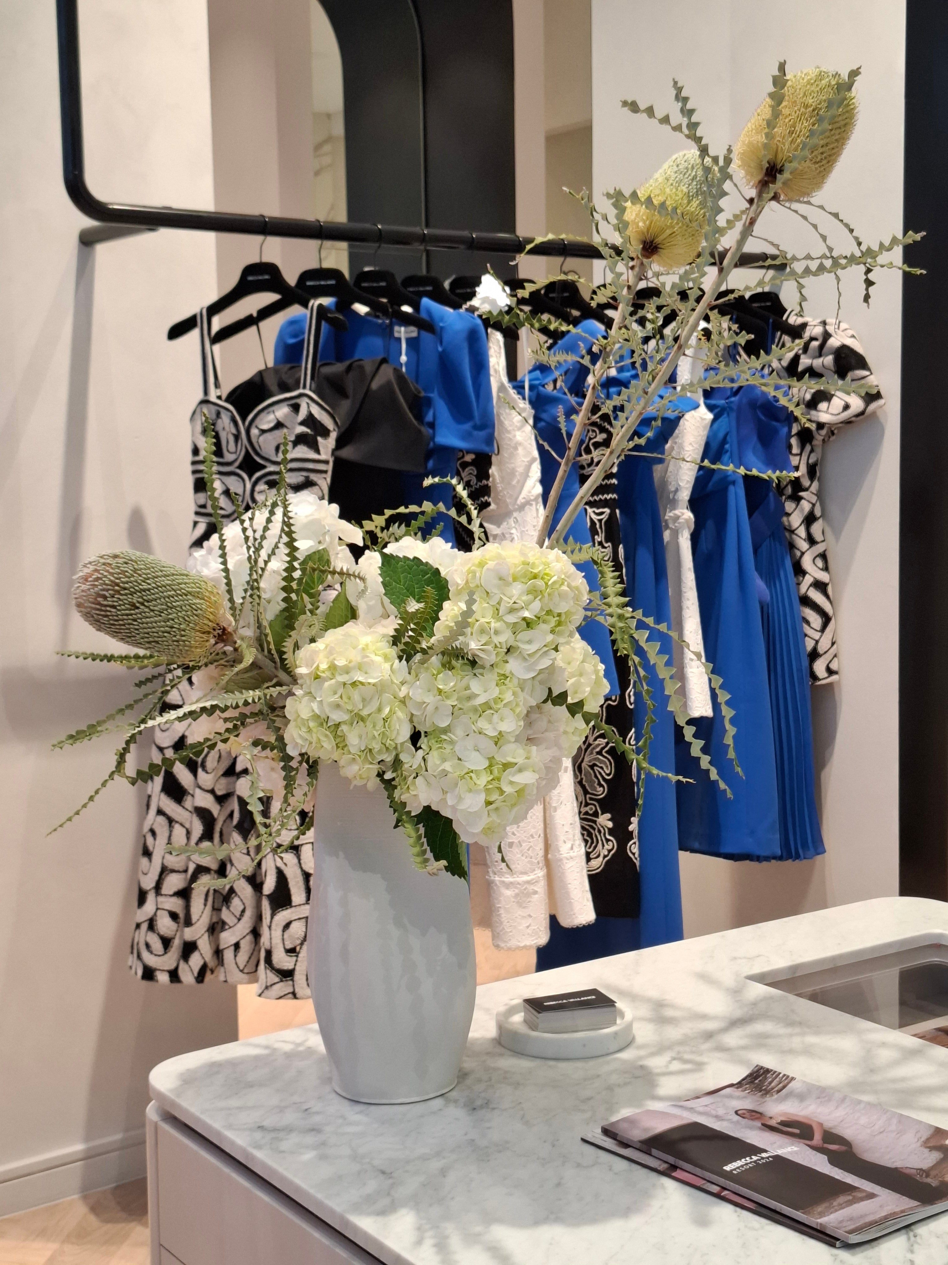 Weekly flowers start from $90 (+GST) and we have a special delivery rate for our corporate clients. We offer hire of our glass vases at no charge for a clean, consistent look, or you can opt to have your flowers arranged into our vintage ceramics which will change each week.