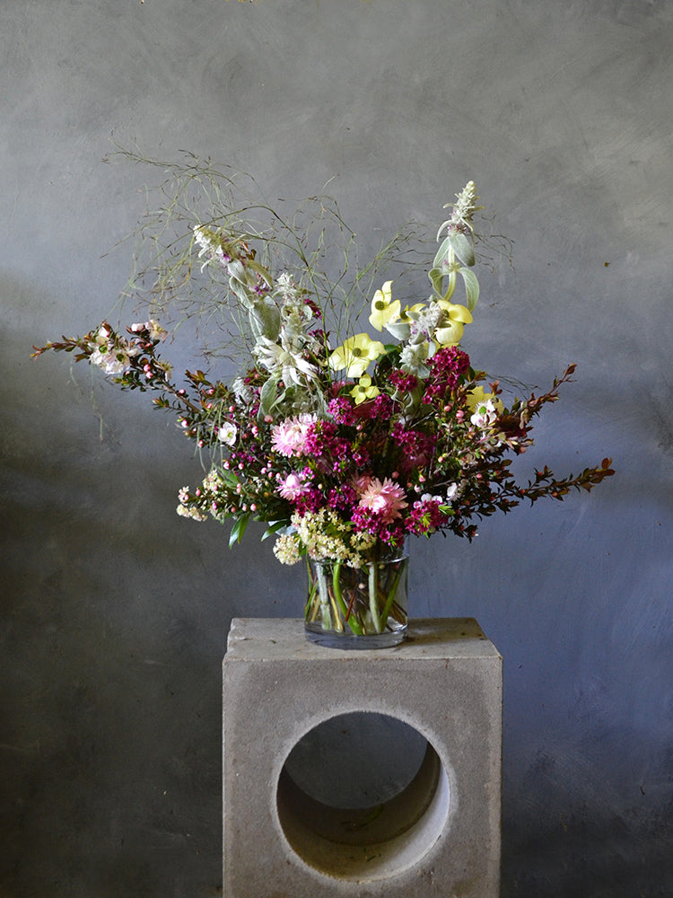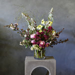 We select the blooms for this arrangement from our local flower farms and use only flowers that are in season to ensure the best quality. Each arrangement is unique and created with skill by our trained florists so no two vases are alike, therefore the images should be taken as a guide only.