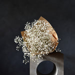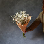 Our bunches of dried gypsophila are presented in recyclable brown paper wrap with a compostable Botany tag attached.