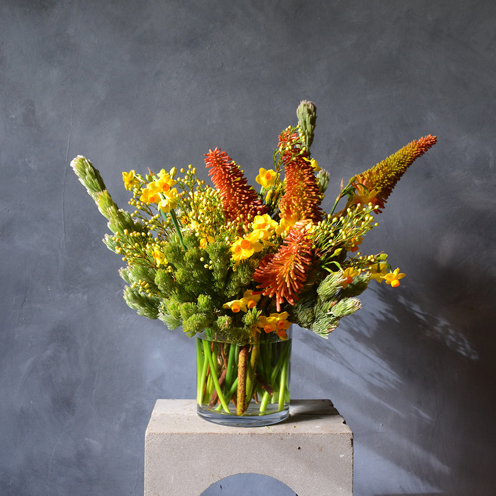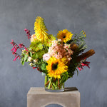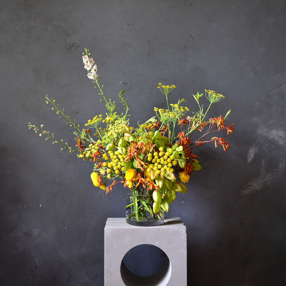 We select the blooms for this arrangement from our local flower farms and use only flowers that are in season to ensure the best quality. Each arrangement is unique and created with skill by our trained florists so no two vases are alike, therefore the images should be taken as a guide only.
